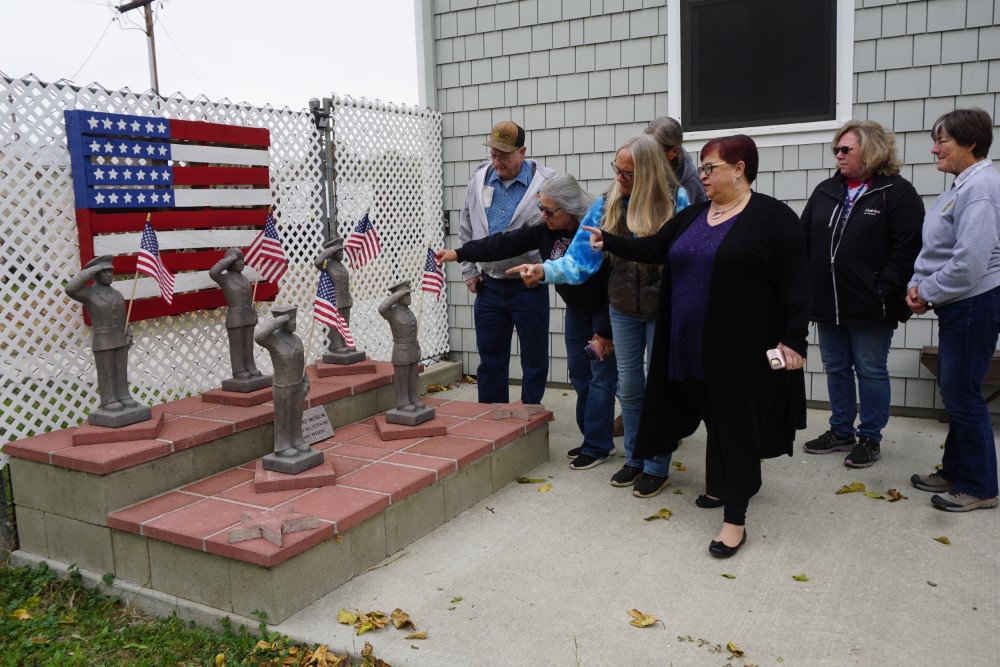 Visitors to the Stonyford Museum on Nov. 5 gather around the new veterans memorial dedicated to the men and women who served or are serving in the five branches of the U.S. military.