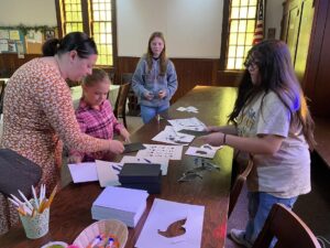 Colusa High School FBLA members help guests at Saturday’s Jane Austen inspired event to cut silhouettes, an inexpensive art form popular in the 18th century.