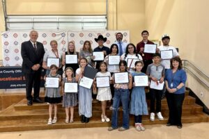 Colusa, CA (MPG) – The annual Colusa County Office of Education “Caring Youth Count” Awards Ceremony took place on April 30 where Colusa County students ages 5-18 received awards for positive contributions made to their communities in the categories of Community Service, Strength of Character, and Heroic Resilience. Pictured in no particular order: Abram Carrillo, Ariana Avera, Clara Dragoo, Cristian Beltran, Hazel Kingsley, Jazline Gonzalez, Kendra Gonzalez Rosales, Makinzie Guzman, Marcos Deniz Jr., Maycie Wynant, Mia Vazquez, Samuel Fantl, Sofia Olivarria Tirado, Valeria Ruiz Cruz, and Xitlali Santana. Not pictured: Janell Garcia, Lizeth Ramirez, and Danica Chavez. Also pictured: Superintendent of Schools Michael P. West, Prevention Services Coordinator Cenza Mehr, and Student Support Services Manager Kevin Douglas. Photo Courtesy.