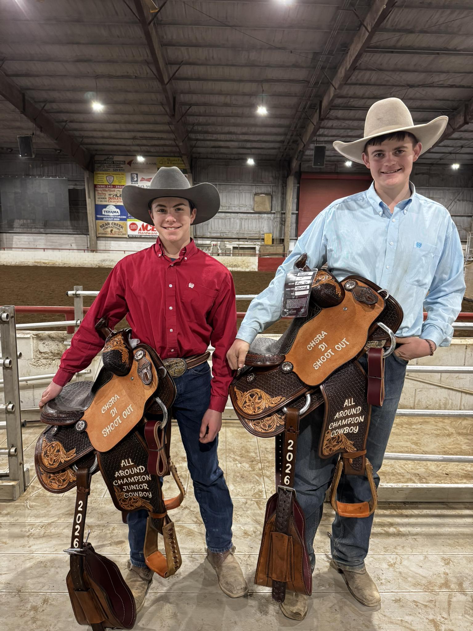 Austin Cline, right, of Pierce High School, won All Around Champion honors at the California High School Rodeo Association District 3 Red Bluff Shoot Out. Trenton Gleason earned All Around Champion in the junior high division. – Photo courtesy of CHSRA – District 3ARBUCKLE, CA (MPG) — Pierce High School student Austin Cline earned the All-Around Champion title at the California High School Rodeo Association District 3 Red Bluff Shoot Out, held in Red Bluff, California. The event featured competitors from across the district in cutting, reined cow horse and junior high rodeo events. Cline led the high school field, while Trenton Gleason captured the All-Around Champion title in the junior high division.