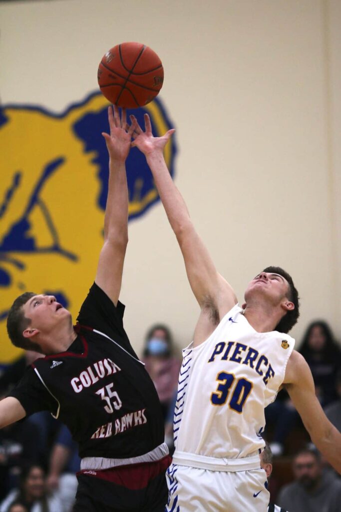 Colusa’s Luke Kalfsbeek and Pierce’s Brayden Hoebel fight for control of the tip in a game on Jan. 26. The Bears went on to defeat the RedHawks 55-53.