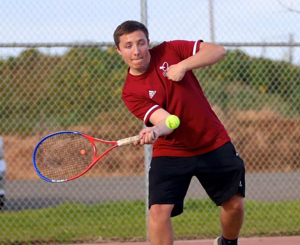 Colusa’s Chris Rodriguez returns a shot in the RedHawks’ match against Corning on March 2. Rodriguez defeated his opponent 6-1, 6-0.