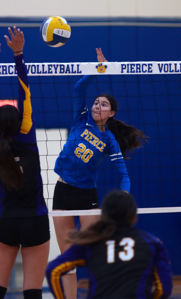 Pierce’s Cindy Corona hits for a kill in the Bears’ sweep of Live Oak on Sept. 27.