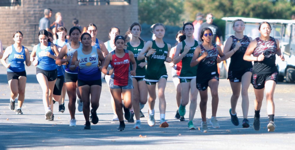 Runners take off at the start of the varsity girl’s race on Sept. 28 at the Arbuckle Golf Club.