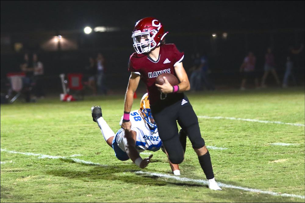 Colusa quarterback Bo Coronado runs out of the tackle attempt by Pierce’s Erick Ambriz in the Redhawks’ 14-13 win over the Bears on Oct. 7.
