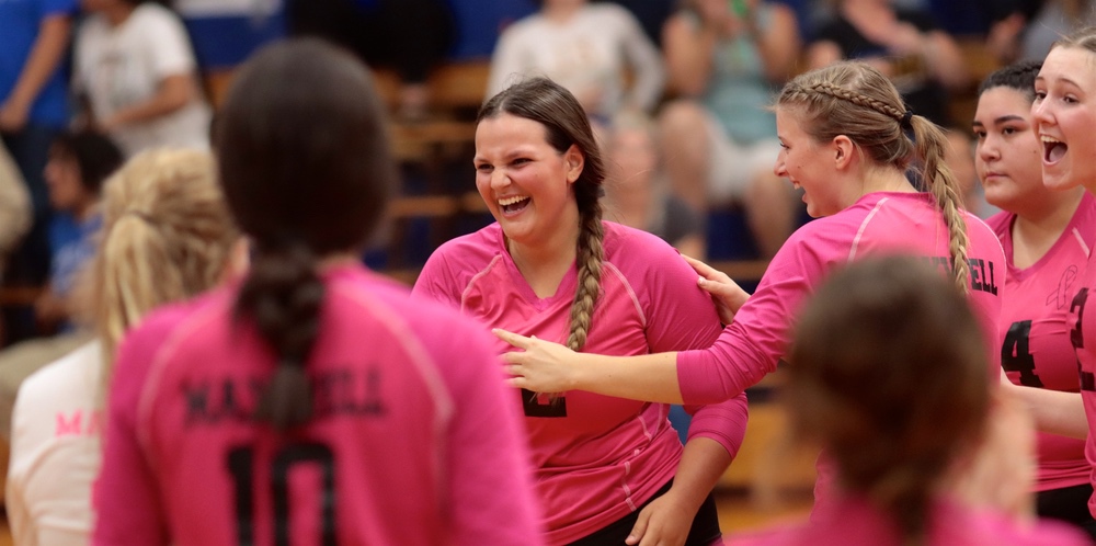 Maxwell’s Sydnee Wilson celebrates with her teammates after serving an ace on match point to lift the Panthers over Hamilton City.