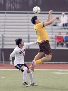 The Yellowjackets’ Daniel Preciado heads a ball during the NSCIF D3 playoff match against Colusa on Feb. 19.